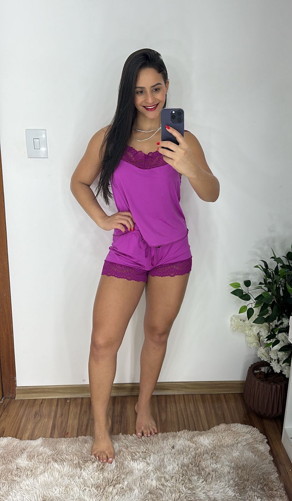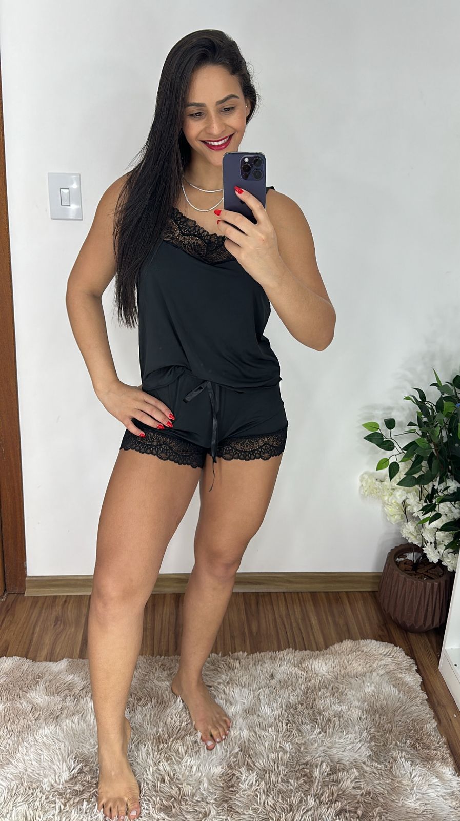 Possui recorte de renda nas coxas trazendo mais charme e sensualidade